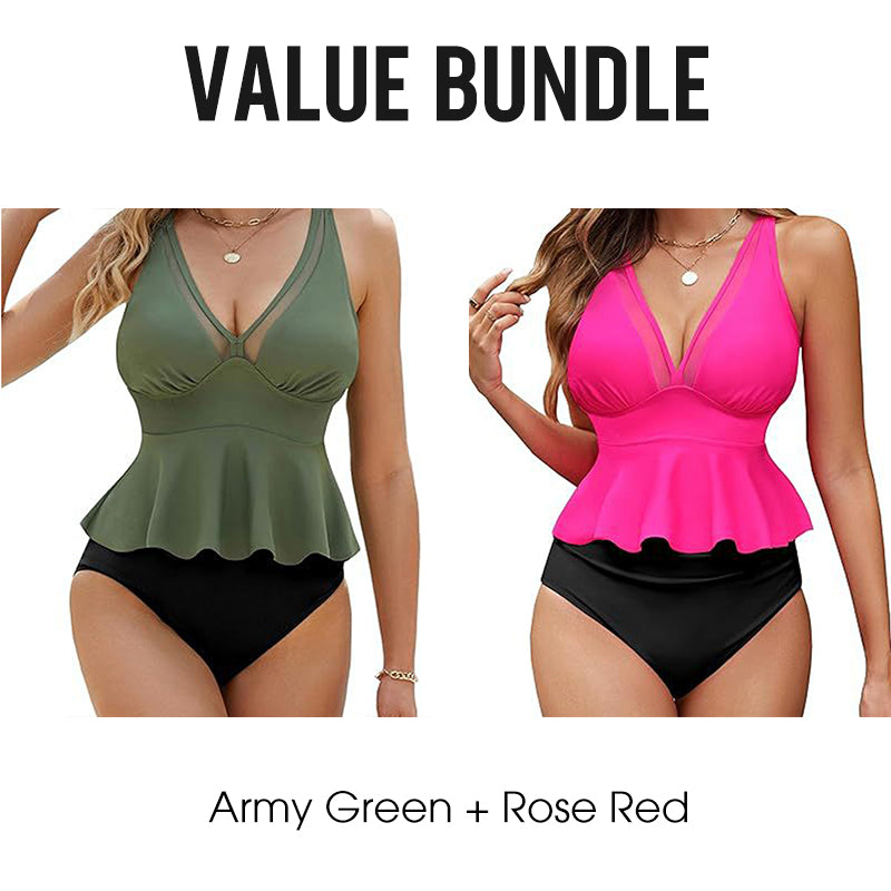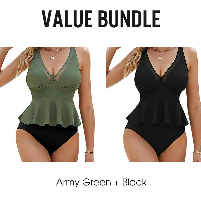 CONJUNTO TANKINI CON VOLANTE FAVORECEDOR - Descubre el impulso definitivo de confianza con nuestro favorecedor conjunto tankini con volante. Diseñado para realzar tus curvas naturales mientras proporciona una cobertura cómoda para usar en la playa todo el día.